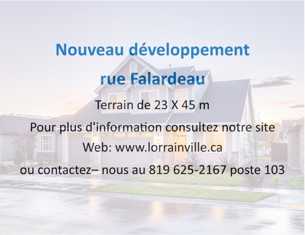 Retour Nouveau développement rue Falardeau La municipalité de Lorrainville est fière d'annoncer un nouveau développement sur la rue Falardeau avec la possibilité de construire à compter de l'automne 2022. Pour plus d'information voir l'annonce. Date de création: 2022-09-15