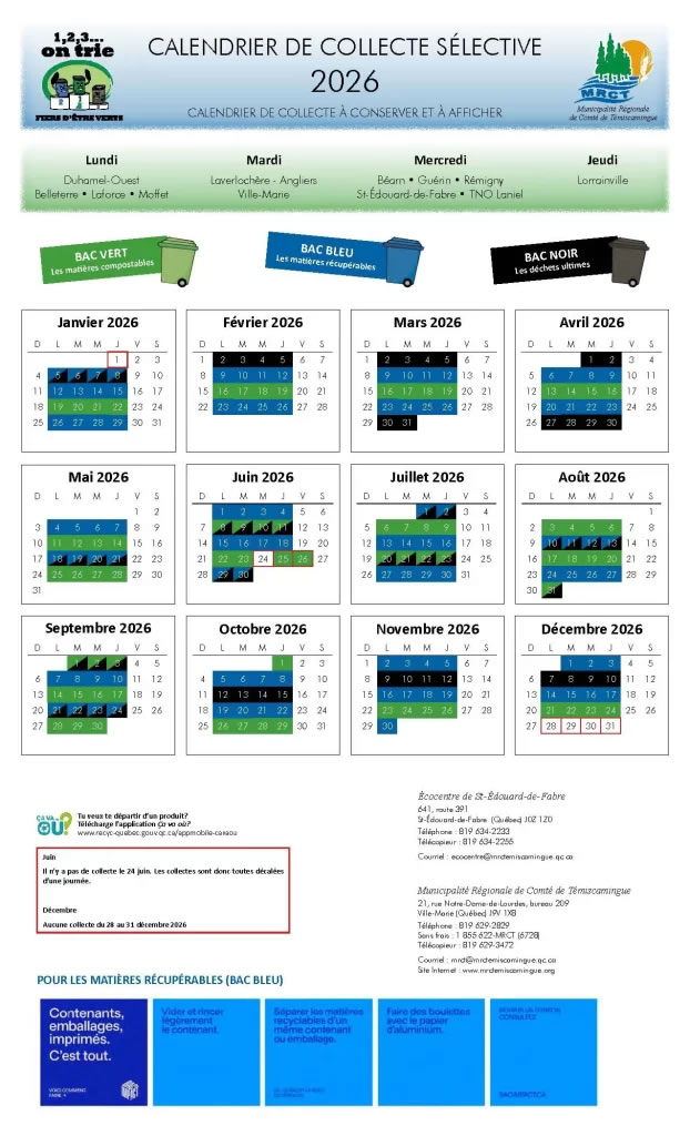 Le Relais d’Écocentre Local (REL) est fermé définitivement. La municipalité a conclu une entente avec la MRC de Témiscamingue et vous devez aller porter vos items, gratuitement, à l’écocentre de Fabre, situé au 641, route 391 à St-Édouard-de-Fabre. Consultez le site internet pour plus d'informations.